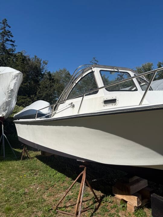 This is a 1986 Steiger Craft Block Island 25 with a 1999 Yamaha 200HP outboard motor. Portland Yacht Services replaced Injector Driver and bleed steering system in November 2025. Then cleaned and shrink wrapped for winter storage. Still currently shrink wrapped. There is no trailer that goes with the boat.