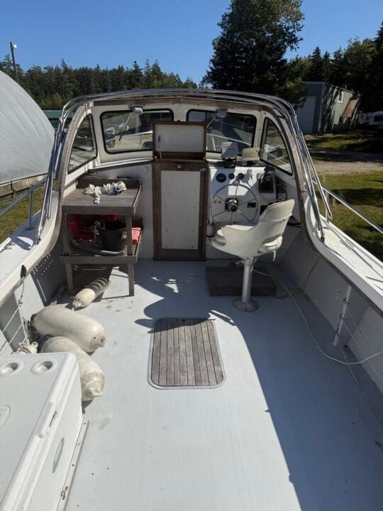 The boat has a VHF, Garmin, Standard Horizon electronics, swim platform, canvas bimini, captains chairs, cushions, portable head, windshield has a small crack.